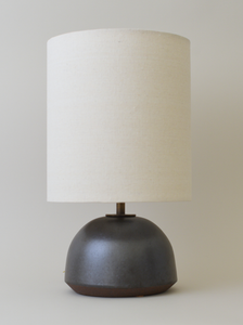 The smallest of our lamp offerings, this petite shape has a short, wide base and a rounded top. Finished in a rustic modern Iron Black glaze, this stoneware lamp is handmade in California, and is completed with an oatmeal linen shade, diffuser top and twisted brown cloth cord (power switch on cord and lamp stem). Given the nature of handmade pottery, the size, finish and shape may vary slightly.