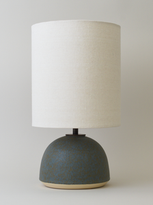 The smallest of our lamp offerings, this petite shape has a short, wide base and a rounded top. Finished in a rustic modern blue glaze with bronze undertones, this stoneware lamp is handmade in California, and is completed with an oatmeal linen shade, diffuser top and twisted brown cloth cord (power switch on cord and lamp stem). Given the nature of handmade pottery, the size, finish color and shape may vary slightly.
