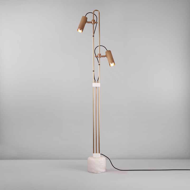 The Spot Floor Light features beautiful stone bases and adjustable brass heads, combining precise illumination with modern industrial elegance.
