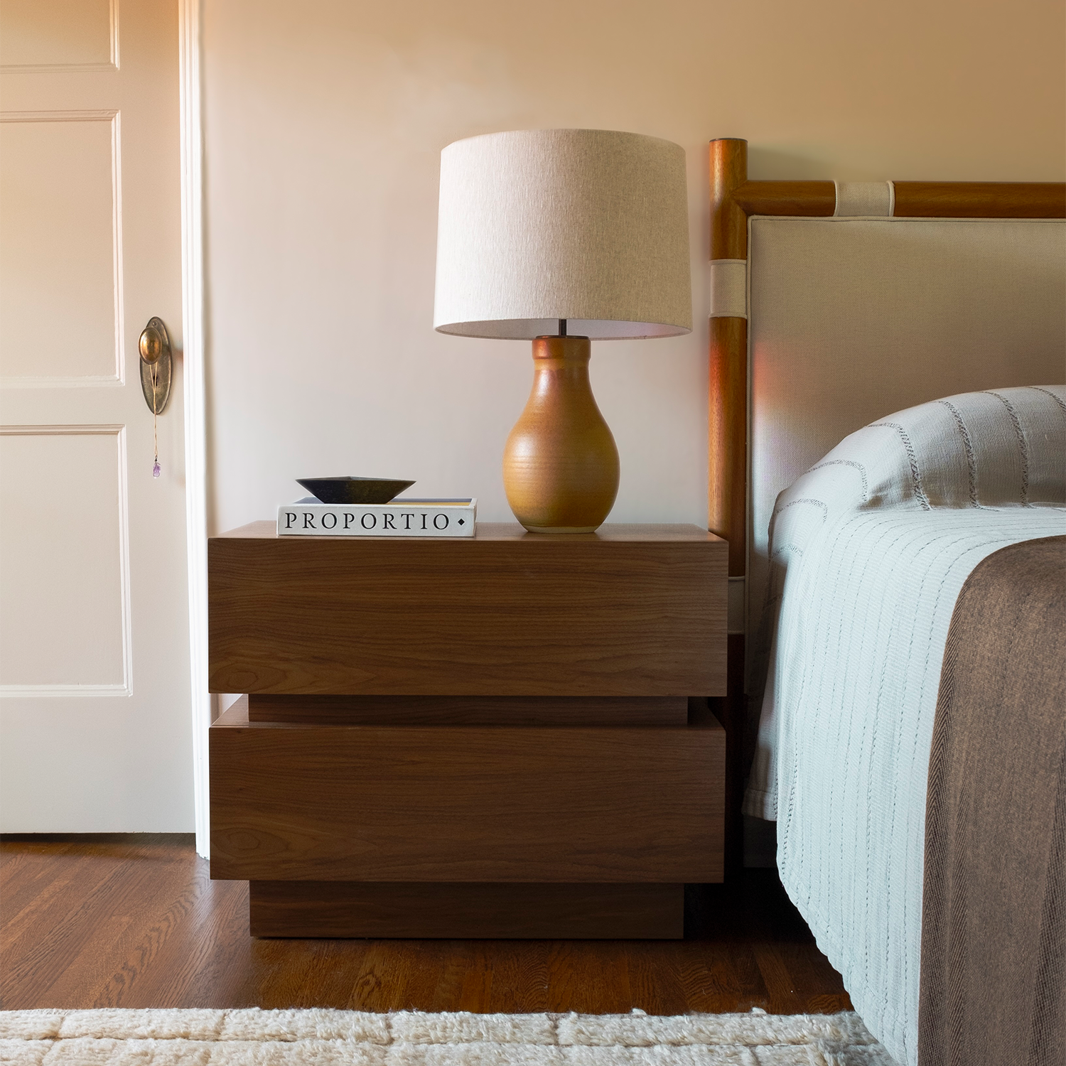 The Stacked Box Nightstand is a bedside table with two drawers that is available in either American walnut or white oak. Available in two sizes. Available with metal inset.