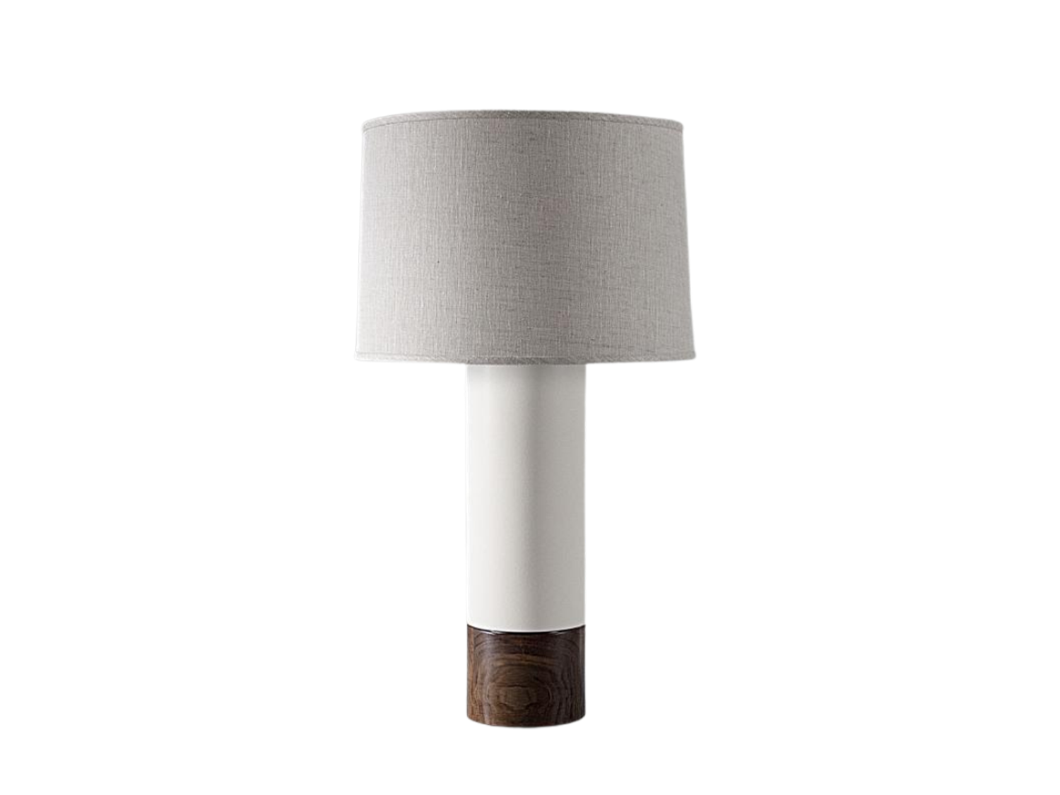 Handcrafted stoneware lamp made in upstate New York by Stone and Sawyer. Please contact showroom for custom glaze options. Images feature satin brass metal, walnut wood, and natural linen shade. Please review lead times and shipping notes in Product Details prior to purchasing.