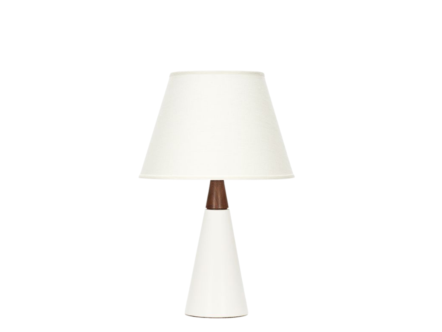 Handcrafted stoneware lamp made in upstate New York by Stone and Sawyer. Please contact showroom for custom glaze options. Images feature satin brass metal, walnut wood, and natural linen shade. Please review lead times and shipping notes in Product Details prior to purchasing.